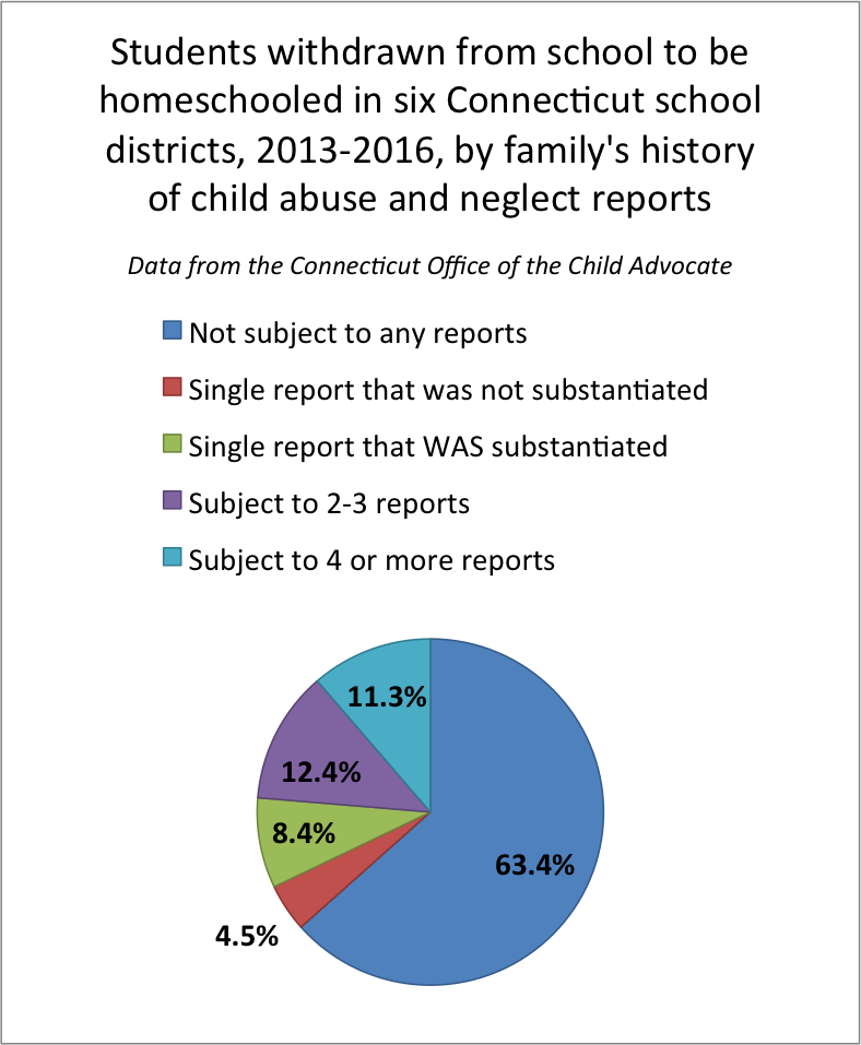 The OCA obtained lists of all students withdrawn to be homeschooled between 2013 and 2016 from six school districts and compared the names with records from the Department of Children and Families. They found that 36% of the 380 students removed from school to be homeschooled lived in families subject to at least one prior accepted report of abuse or neglect. The vast majority of these children (88%) lived in families subject to multiple reports or a single report that was substantiated. Furthermore, the majority of these families (75%) were subject to an accepted report dated 2013 to the present.