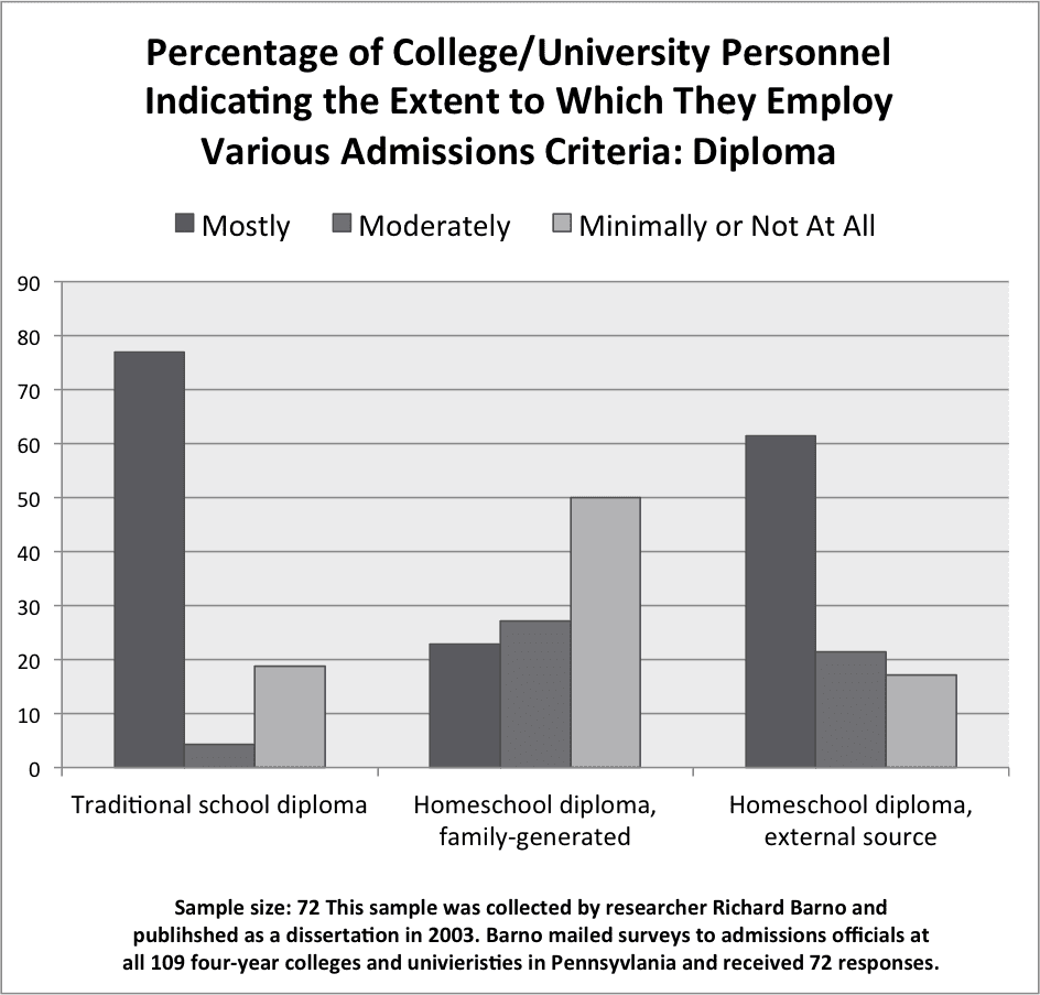How does the fact that the homeschool diploma and transcript are family-generated affect the admissions process? How do admissions officials evaluate these documents? As part of his 2003 dissertation, “The Selection Process and Performance of Former-Homeschooled Students at Pennsylvania’s Four-Year Colleges and Universities,” Joseph Richard Barno sought to answer these questions by sending surveys to admissions officers at all 109 four-year colleges and universities in Pennsylvania. Ultimately, he collected responses from 72 schools.