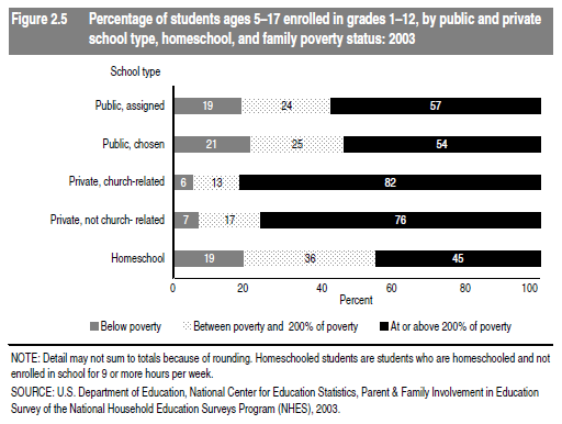 The National Center for Education Statistics (NCES) has consistently found that around 20% of homeschooled students are below the poverty rate, a number comparable with public school rates. However, looking at these numbers alone masks several differences in the respective populations. In 2007 the NCES found that 2.2% of students in households that made less than $20,000 were homeschooled while 3.1% of students in households that made between $20,000 and $50,000 were homeschooled, along with 4.0% of students in households that made between $50,000 and $75,000. This suggests that homeschooled students under the federal poverty line tend to be clustered closer to that line than public school students, and thus that students in extreme poverty are less likely to be homeschooled.