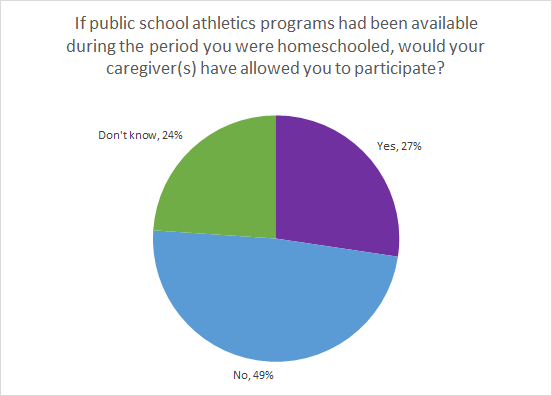 Out of 33 respondents who reported that public school athletics were available to them, 7 (or 21%) reported that they were prevented from participating by their parents. However, the actual number may be higher; some of the respondents who reported that they did not know whether public school athletics were available to them while they were homeschooled may have been prevented from participating by their parents without being aware of it.