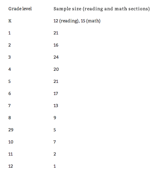 - Demographically, the sample was comparatively young; 78% of the participants were in grades K-6. The largest plurality of participants (41%) submitted scores from the SAT, while the rest submitted scores from other standardized tests.
