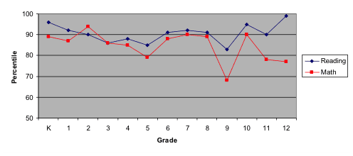 - These homeschoolers scored, on average, in the 90th percentile in reading, the 89th percentile in science, the 87th percentile in math, the 87th percentile in social studies, and the 83rd percentile in language.