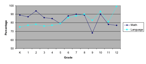 - In general, the math scores of Ray’s participants tended to decrease in comparison with the national average as students aged, while Ray’s participants’ language scores tended to increase in comparison with the national average (represented here by the x-axis). (Note that for grades K-2, Ray’s sample size was smaller for language than for math.)