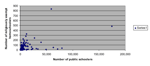 However, if we remove the outliers of Fairfax and Chesterfield Counties, the correlation essentially disappears (r = .16). This means that there is little relationship between the number of public schoolers and the number of religiously exempt homeschoolers in a district.