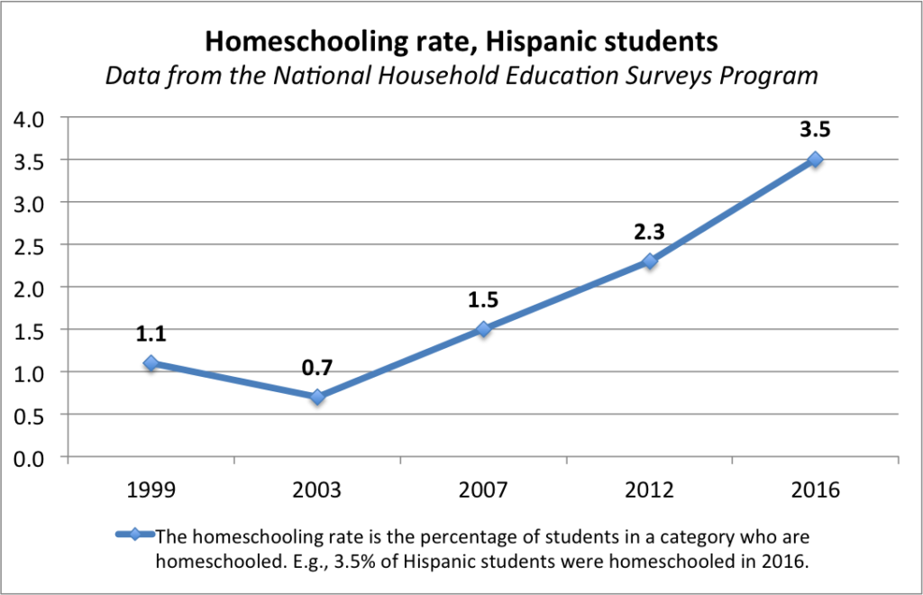 Analysis: The NHES 2012 and NHES 2016 found sharp increases in the rate of homeschooling among Hispanic students. According to NHES estimates, the number of Hispanic children being homeschooled rose from just over 250,000 to just under 450,000 between 2012 and 2016.
