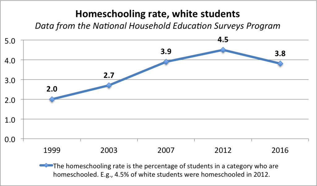 Analysis: The NHES 2016 was the first to find a decline in the homeschooling rate among white children. According to NHES estimates, the number of white children being homeschooled fell from 1,200,000 to 1,000,000 between 2012 and 2016.