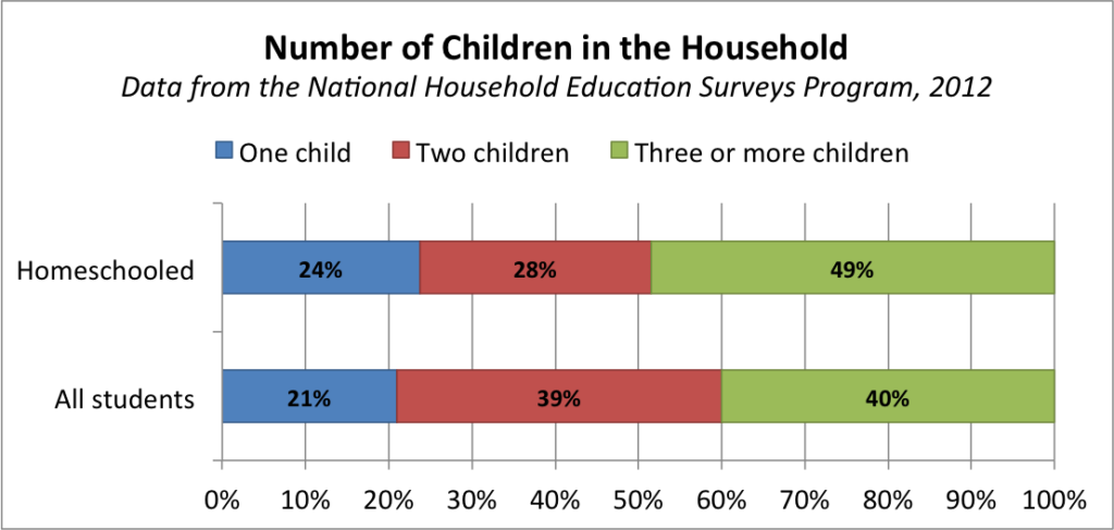 Analysis: The NHES 2012 found that a quarter of homeschooled students were the only child in their household while half of homeschooled students lived in households with three or more children; this represents a change from the first decade of this century, when the percentage of homeschooled children in households with only one child hovered around 12% and the percentage in households with three or more children hovered around 60%.