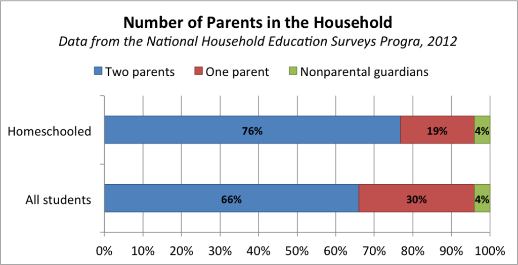 Analysis: The NHES 2012 found that homeschooled children were more likely than other children to live in households with two parents (biological, adoptive, step, or foster). Roughly one in five homeschooled children lived in a household with one parent (compared with nearly a third of students overall).