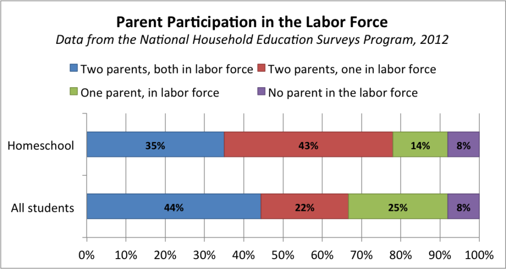 Analysis: The NHES 2012 found that homeschooled children were more likely than other students to have two parents with one in the labor force. While the survey found that over a third of homeschooled children have two parents in the labor force, what this looks like in practice is unclear; in some cases a homeschooling parent may stay home to educate their children while taking on flexible work on the side.
