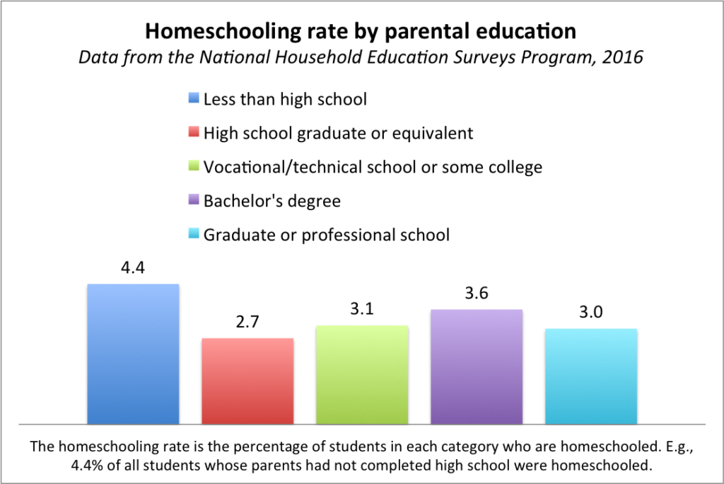 Analysis: The NHES 2016 found the highest rate of homeschooling among parents who had not completed high school, followed by parents with bachelor’s degrees.