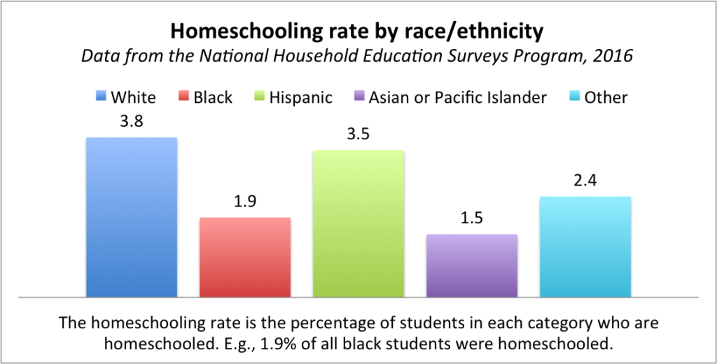 Analysis: The NHES 2016 found that 1.9% of black students and 1.5% of Asian and Pacific Islander students were being homeschooled. Black, Asian, and Pacific Islander students are less likely to be homeschooled than white or Hispanic students. The number and rate of Asian and Pacific Islander students being homeschooled declined between 2012 and 2016 (from 2.6% to 1.5% and from 73,000 to 48,000) while the number and rate of black students being homeschooled remained steady.