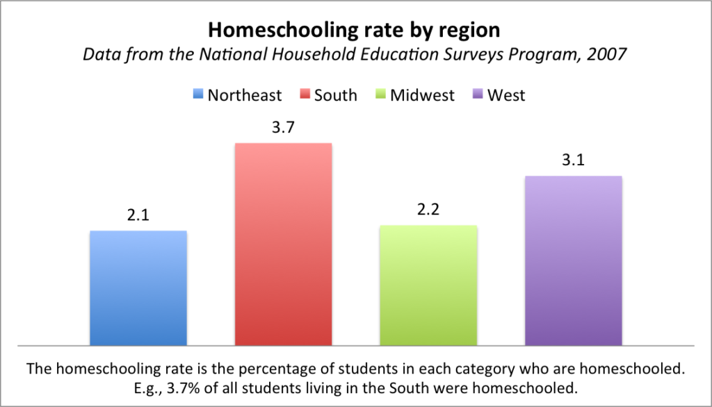 Analysis: Unfortunately, the NHES stopped reporting region after the 2007 survey. With the demographic changes found in the NHES 2012 and NHES 2016, we cannot assume that the regional patterns in the NHES 2007—a higher rate of homeschooling in the South and West—hold true today.
