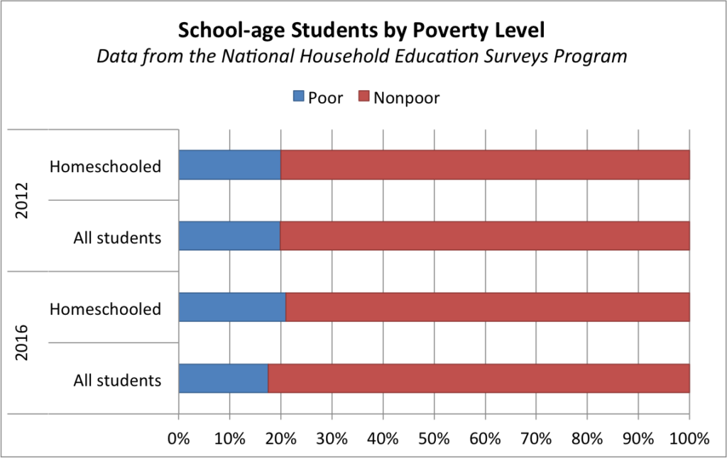Analysis: The NHES 2016 found that students in poverty were homeschooled at a higher rate than non-poor students. The NHES 2012 found that the homeschooling rate was roughly the same for poor students (3.5) as for non-poor students (3.4).