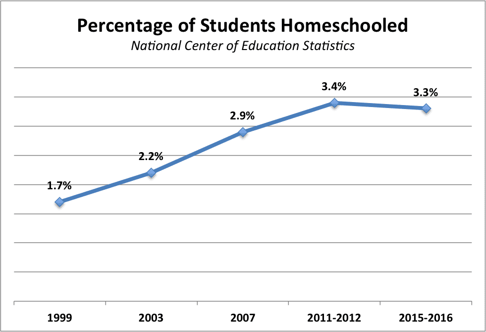 • As of 2015-2016, around 1,690,000 children, or 3.3% of all school aged children, were being homeschooled.