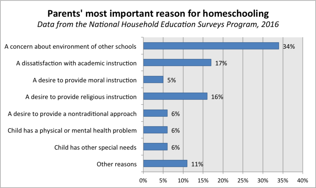 Analysis: Roughly one-third of parents (34%) surveyed in the 2016 NHES selected concern about the environment of other schools as their most important reason for homeschooling. This was in response to the question “You are concerned about the school environment, such as safety, drugs, or negative peer pressure?” This would include concerns about bullying. After concerns about the environment of other schools, the next highest reasons parents selected as their most important reason for homeschooling were dissatisfaction with academic instruction (17%) and a desire to provide religious instruction (16%).