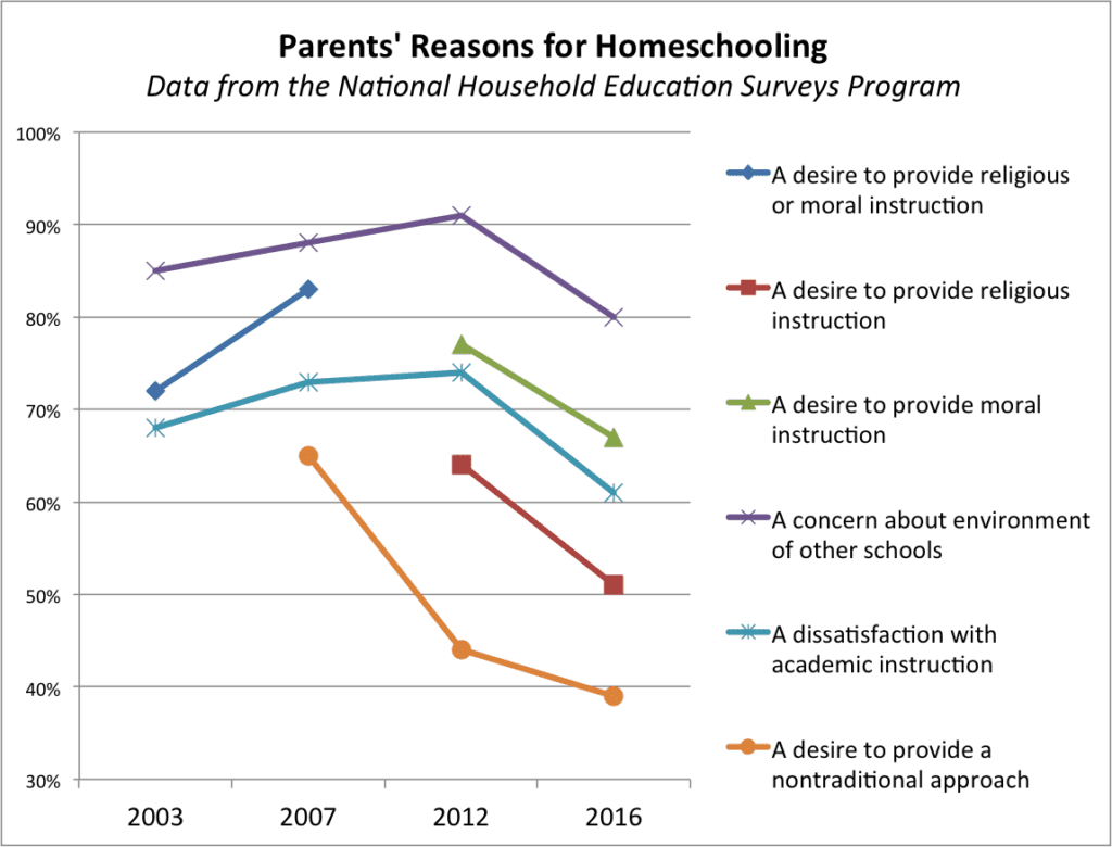 Every four years, the National Center for Education Statistics (NCES) conducts its National Household Education Survey (NHES). This survey provides the most comprehensive data we have on parents’ motivations for homeschooling.