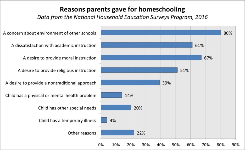 Analysis: In the 2016 NHES, most common reason parents gave for homeschooling was a concern about the environment of other schools (80%). Almost two-thirds of homeschooling parents cited dissatisfaction with academic instruction at other schools (61%). Large numbers of parents also indicated that they were homeschooling to provide to provide moral (67%) or religious (51%) instruction or in order to provide a nontraditional approach to a child’s education (39%). Comparatively fewer parents cited physical or mental health problems (14%), special needs (20%), or temporary illness (4%).